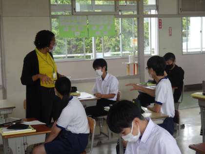 今日の学習課題は、「英語で俳句を作ってみよう」ということで、日本語での俳句づくりとは少し考え方が違い、五・七・五の縛りがなく、季語も必要なし。しかし、逆にこれが生徒たちを悩ませていたようです。