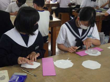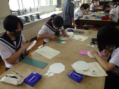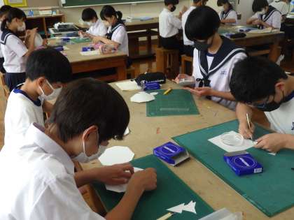 ガラス細工・サンドブラスト加工での作品づくりの第1段階の作業です。ガラス本体にマスキングシートを貼っています。納得のいく作品づくりに重要な作業過程の一つです。