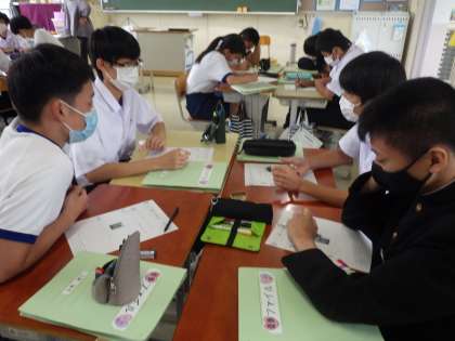 「おもてなしの心」について、仲間と考えを共有していました。お客様をお出迎えする時と見送る時にはどんな気持ちで接するか、実際に行動に表すことができるかなどをグループごとにシミュレーションをしていました。