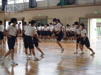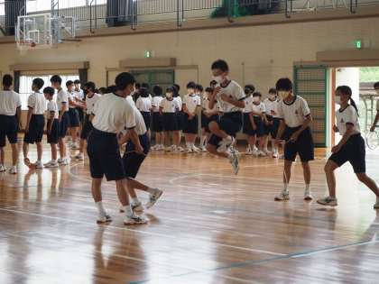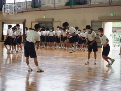 本日のOP練習・8の字跳びの様子です。雨天のため、体育館での練習です。