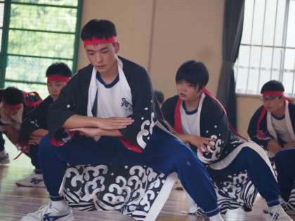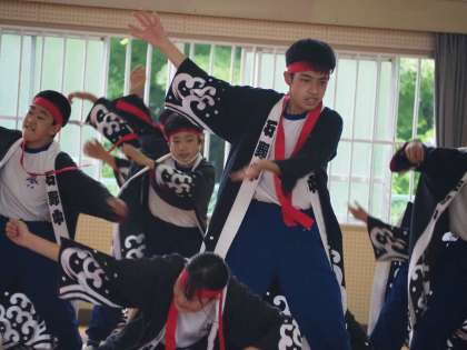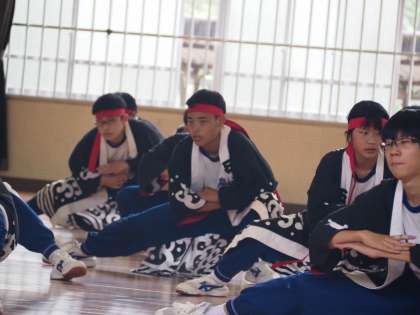 各係での器具点検や動きの確認をしたあと、再びバンテンとはちまきを身に付けてのソーラン練習です。午前中の反省を生かし、本番前、最後の練習です。