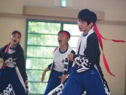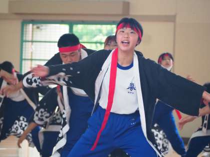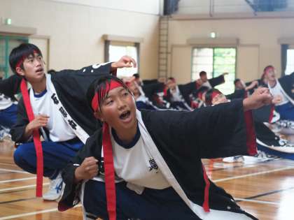 各係での器具点検や動きの確認をしたあと、再びバンテンとはちまきを身に付けてのソーラン練習です。午前中の反省を生かし、本番前、最後の練習です。