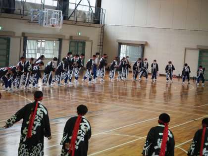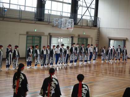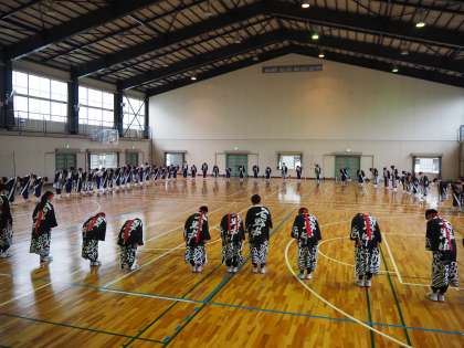 本番前、最後のソーラン練習を終え、明日のOPへの意気込みを確認すべく、恒例となった「闘魂注入」の場面です。円陣を組み、全校生徒でOPの成功と全員が全力で競技に向かい、最高の演技をすることを誓っています。