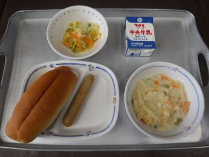 今日の献立は、マカロニのクリーム煮、アスパラサラダ、ホットドッグ、サンドイッチロール、牛乳 でした。 エネルギー:850kcal