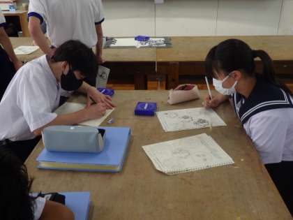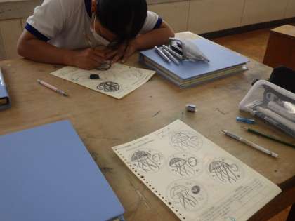 サンドブラスト加工のガラス作品の制作に取り組んでいました。これまでに描き出したアイデアスケッチをの中から、教科担任にアドバイスをもらいながら、デザインを確定していきます。確定したデザインにさらに微調整を加え、作品づくりの作業段階がまた一つ上がっていきます。