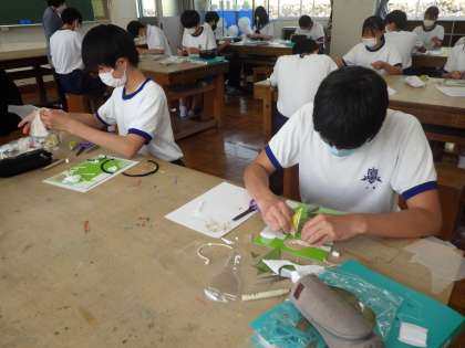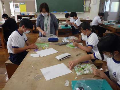 コラグラフの技法を使った版画の版づくりに取り組んでいました。抽象的なデザインに悪戦苦闘していましたが、次第にイメージができ始め、活動のスピードも上がってきました。