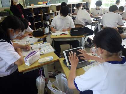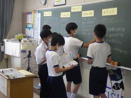 教科担任に示された各項目についてグループでまとめ、発表していきます。必要な情報を教科書やタブレットから探し出し、仲間に分かりやすく説明するために、全員が協力して学習を進めていました。