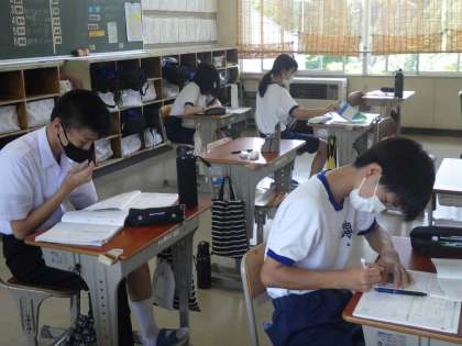 テスト週間になれば、当たり前のように学習モードに切り替わる3年生。勉強のスタイルもさまざまで、仲間と問題を出し合ったり、一人黙々と自分の計画したメニューに取り組んでいる生徒もいます。
