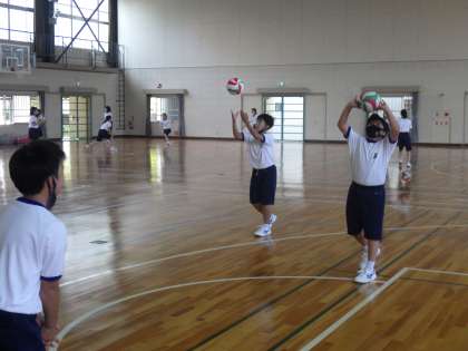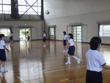 バレーボールの学習に入っていました。まずは個人の技能を高めるためのメニューに取り組み、その後、ペアを組んでパスの練習です。なかなか思うようにボールが飛ばず苦戦しているようでしたが、何度も繰り返し楽しく活動を行っていました。