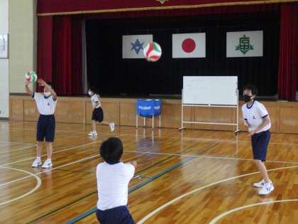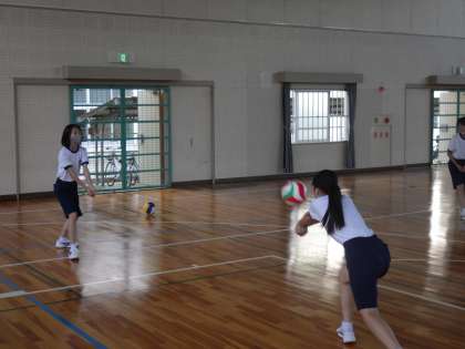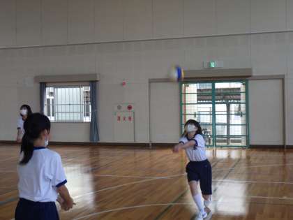 バレーボールの学習に入っていました。まずは個人の技能を高めるためのメニューに取り組み、その後、ペアを組んでパスの練習です。なかなか思うようにボールが飛ばず苦戦しているようでしたが、何度も繰り返し楽しく活動を行っていました。