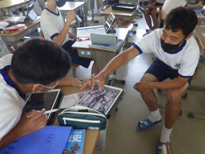 5/25 仲間との意見交換を交えながら… 2 公開日 2022/05/26 更新日 2022/05/26 各学年から 2年生の社会の授業の様子です。 日本に伝わった宗教の学習を行っていました。古い時代までさかのぼり、中世ヨーロッパとイスラム世界、キリスト教世界とその外の世界など、これまでの日本の歴史に影響を与えた宗教を確認し、歴史がどう変わっていたのかを学んでいました。