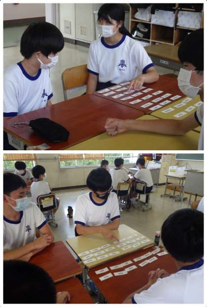 一般動詞の変化について学んでいました。これまで学習した一般動詞が、現在形—過去形—過去分詞とどのように変化していくのか、復習と間違えやすいものの覚え直しを、仲間とゲーム感覚で楽しみながら学習していました。