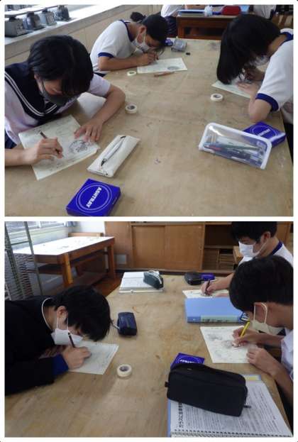サンドブラスト加工を利用したガラス作品の制作です。今日は、いよいよデザインを確定し、それをシートに移す作業を行っていました。教科担任のアドバイスをもとに、また一つ次の工程に移っています。