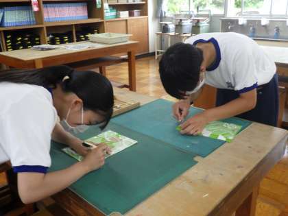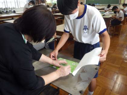 今日は、イメージどおりにパーツを貼り付けた生徒から、空刷りの作業です。どんな感じに刷り上がるのかを試し、微調整を加えていきます。今後は、この作品に合ったイメージの色を考え、作品を完成させる予定です。