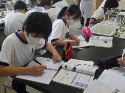 匂いと闘いながら実験を行う教科担任の姿を見ながら、実験結果と実験の安全についても学んでいました。