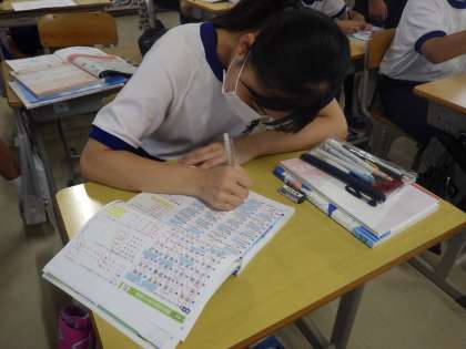 前期中間テストを来週に控え、まずは重要漢字のおさらいが行われ、その後、国語のテスト勉強仕方がレクチャーされていました。漢字の練習の仕方、問いに対しての答え方など、ポイントを押さえての勉強法が伝授されていました。