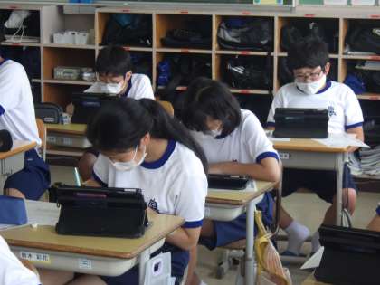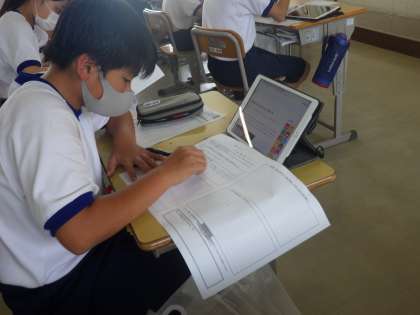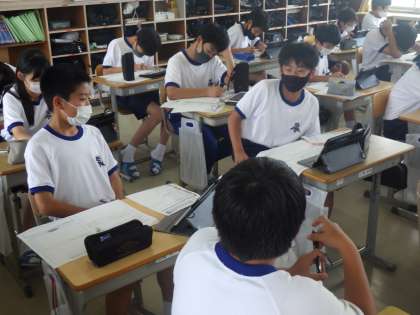 SDGsについて、個々でテーマを決めての調べ学習を行っていました。仲間のアイデアも参考にしたり、分からない言葉を教え合ったりしています。