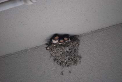 昼過ぎにツバメの巣を見に行くと、朝は警戒して頭しか見えなかったツバメたちが、親の運んでくれるエサを待っているのか、しっかりと顔をのぞかせてくれました。