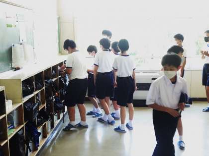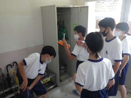 清掃道具の点検をはじめ、各教室のロッカーの整頓の様子も確認していきます。良い取組はどんどん自分たちのクラスにも取り入れようと、熱心に観察しています。