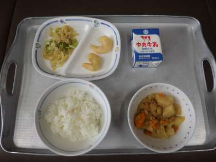 今日の献立は、じゃがいもとツナのうま煮、ごま酢あえ、えびフリッター、ごはん、牛乳 でした。 エネルギー:811kcal