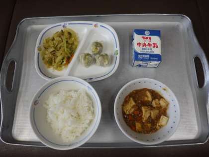 今日の献立は、麻婆豆腐、拌三絲(バンサンスー)、野菜入りしゅうまい、ごはん、牛乳 でした。  エネルギー:796kcal