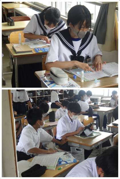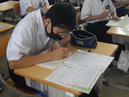 初日のテストが終わりましたが、翌日のテストに向けての勉強が始まっていました。写真は1年生の様子です。