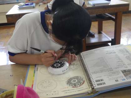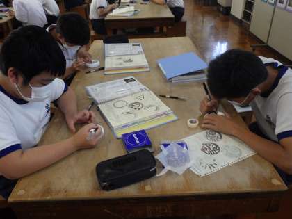 サンドブラスト加工によるガラス製品の作品づくりに取り組んでいました。決定したデザインを製品本体に貼り付け、それをカットしていきます。ガラスを傷つけないよう、丁寧な作業が要求されます。中でも細かなデザインの生徒はその作業をさらに慎重に行わなければなりません。