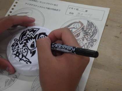 サンドブラスト加工によるガラス製品の作品づくりに取り組んでいました。決定したデザインを製品本体に貼り付け、それをカットしていきます。ガラスを傷つけないよう、丁寧な作業が要求されます。中でも細かなデザインの生徒はその作業をさらに慎重に行わなければなりません。