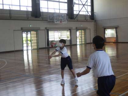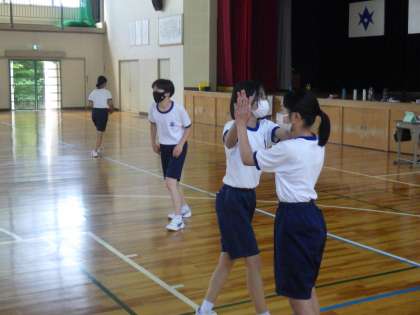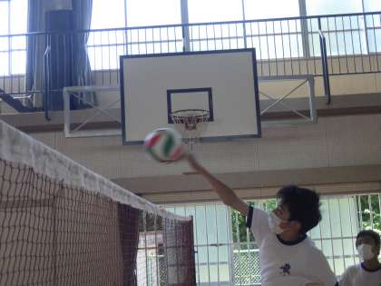 バレーボールの学習が行われていました。3〜4人のチームに分かれ多くのチームを対戦を繰り返していきます。男女混合のチームで、ソフトミニバレーボールのコートでのゲームです。特別なルール—を設定し、全員がバレーボールの楽しさを味わうことができるよう、工夫がされていました。