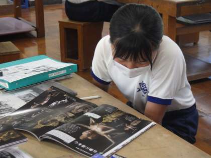 鑑賞の学習で、テーマは「時代によって異なる仏像の姿」でした。時代背景を学びながら、その特徴を探っていきます。しっかりと写真を見比べながら、教科担任に解説でその違いに迫っていきます。