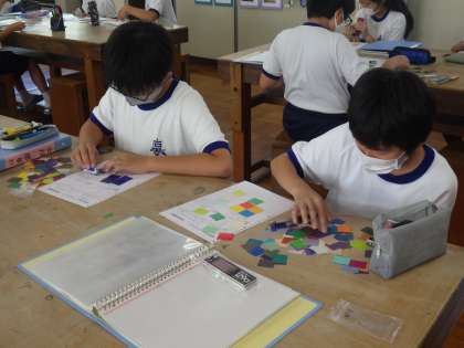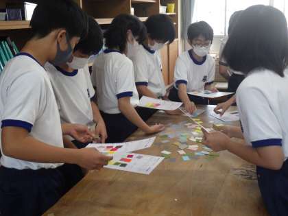 作品づくりの基礎となる配色計画を学んでいました。これからの作品づくりに向けて、自分のイメージした色のトーンや色相を考えていきます。同じ色でも持っているイメージによってトーンや色相の配色が違っています。仲間の意見も参考にしながら、しっかりと活動が進められていました。