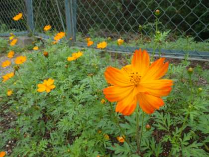 学校のあちこちで見られる自生するキバナコスモス。3年前に種を植えたことから今の状態になったと考えられます。