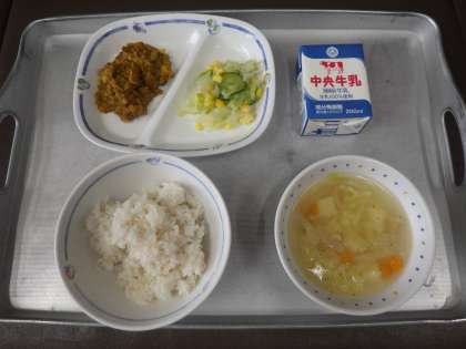 今日の献立は、パスタスープ、コーンサラダ、お豆のドライカレー、麦ごはん、牛乳 でした。 エネルギー:793kcal