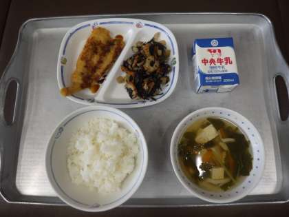 今日の献立は、すまし汁、ひじきの煮付け、にぎすフライ、ごはん、牛乳 でした。 エネルギー:775kcal