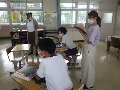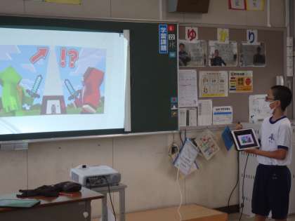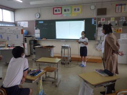 ALTとのコミュニケーション力を上げる活動です。自分が紹介したいキャラクターについて英語でヒントを出し、仲間に答えてもらうゲームです。ひと通りヒントを出したあとは仲間からの質問です。「それはどんな色ですか?」「何の動物ですか?」など、質問されたことにも丁寧に英語で答えていきます。教科担任やALTにアドバイスをもらいながら、一生懸命英語で話していました。