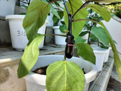 3年生が技術科の授業で栽培を始めたナスが実をつけ始めました。毎朝の水やり、タブレットに写真を保存しての観察日記など、日々の活動を怠らずに確実に取り組んでいます。中でも感心するのが、休日の部活動で登校した際、その日は登校しない仲間の鉢にも水やりをやっていることです。