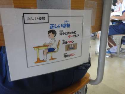 意識を高めるため、特に「2」について3年生の教室では、各自の椅子にポイントを示したものが貼り付けられています。暑さの厳しい時期ですが、夏休みを前にしっかりと授業に向かう取組を行っています。