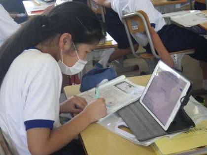 伝えたいことを「want to〜」を使って表す学習に取り組んでいました。まずは日本語で考え、タブレットなどを用いて英文に直していきます。教科担任にアドバイスをもらったり、英文の確認をしてもらったりしながら、仲間と考えを共有していきます。