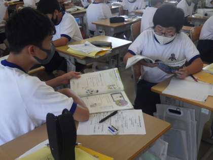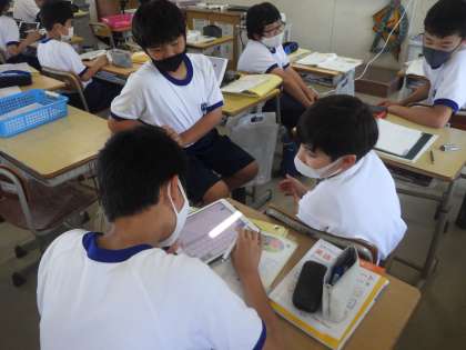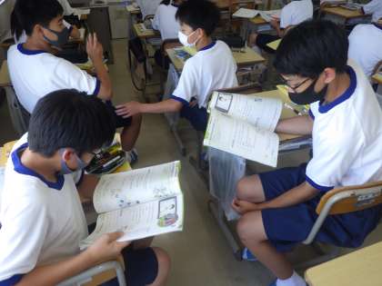 伝えたいことを「want to〜」を使って表す学習に取り組んでいました。まずは日本語で考え、タブレットなどを用いて英文に直していきます。教科担任にアドバイスをもらったり、英文の確認をしてもらったりしながら、仲間と考えを共有していきます。