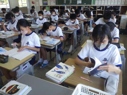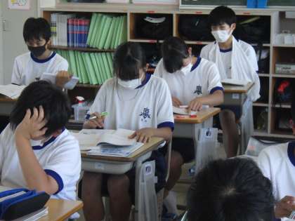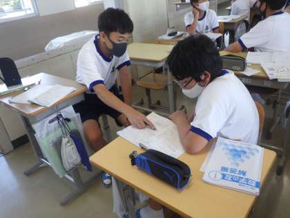 正の数・負の数の様々な問題に取り組んでいきます。授業の前半は個人で必死に解き、後半は仲間との教え合い(=旅立ち学習)に取り組みます。