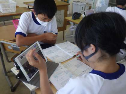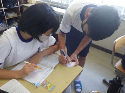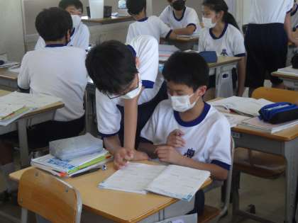 正の数・負の数の様々な問題に取り組んでいきます。授業の前半は個人で必死に解き、後半は仲間との教え合い(=旅立ち学習)に取り組みます。