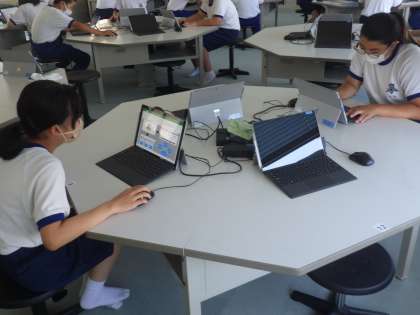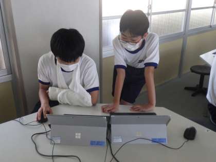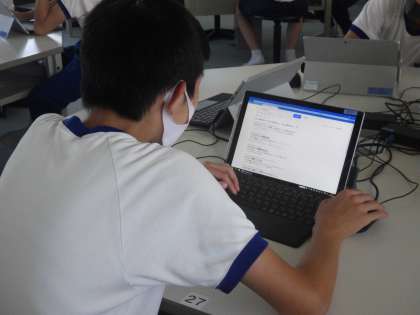 1年生は、作成してきた自己紹介のパワーポイントを使って発表していきます。その後、2・3年生は統計グラフコンクールに出品する作品づくりに取り組んでいました。