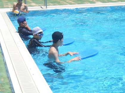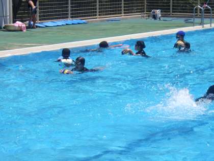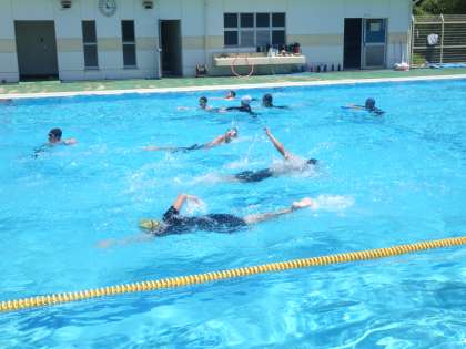 クロールを完全にマスターするため、グループに分かれてのメニューで仲間と声をかけ合いながら練習に励んでいました。時間いっぱいしっかり練習したあとは、学習の成果を確認するためのタイム計測と泳ぎ方の確認が行われていました。