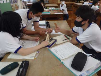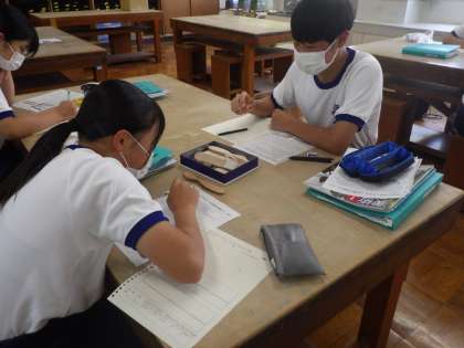木彫の学習です。テーマは「やさしいバターナイフ」。サンプルの作品を手に取り、自身がイメージするバターナイフのデザインを考えていました。イメージどおりの作品になるよう、がんばって作品づくりを進めてもらいたいと思います。