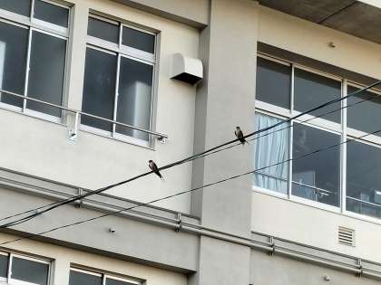 校舎の軒下に巣を作り、立派に成長しているツバメ。朝から元気に飛び回っています。日中は暑さのためか、はたまたエサを求めて遠くまで行っているのか、あまり姿を見ません。ただ、夕方になり、徐々に気温が下がり始めるころ、体育館前の電線によく止まっているのを見かけます。