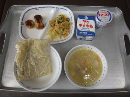 今日の献立は、とんこつラーメン(中華めん)、中華あえ、揚げしゅうまい、ヨーグルト、牛乳 でした。  エネルギー:819kcal