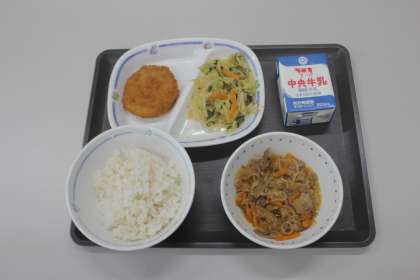 今日の献立は、豚丼(麦ごはん)、アーモンドあえ、枝豆コロッケ、牛乳 でした。 エネルギー:863kcal