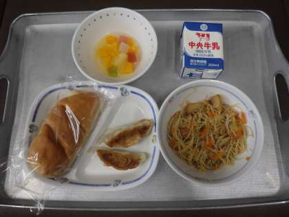 今日の献立は、炒めビーフン、ゼリーミックス、ぎょうざ、米粉パン、牛乳 でした。 エネルギー:805kcal
