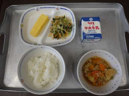 今日の献立は、じゃがいものそぼろ煮、おひたし、厚焼き卵、ごはん、牛乳 でした。 エネルギー:786kcal