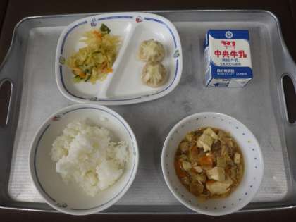今日の献立は、豆腐の中華煮、拌三絲(バンサンスー)、ショウロンポウ、ごはん、牛乳 でした。 エネルギー:832kcal